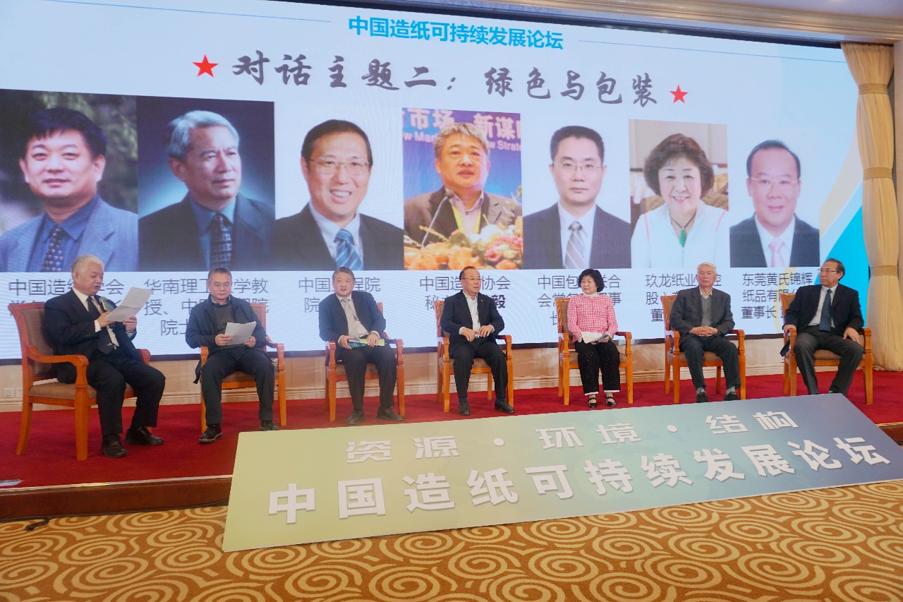 中国造纸学会常务副理事长曹振雷主持了“绿色与包装”主题对话,邀请华南理工大学教授、中国工程院院士陈克复,中国清洁生产的奠基人之一、中国工程院院士段宁,中国包装联合会常务副理事长兼秘书长王跃中,中国造纸协会秘书长钱毅,玖龙纸业(控股)有限公司董事长张茵,东莞黄氏锦辉纸品有限公司董事长黄胜雄等6位嘉宾进行交流,造纸行业在科技进步、包装生产流通、纸业的经济贡献、电商的促进作用、环境保护取得的进步等话题进行了深入探讨。