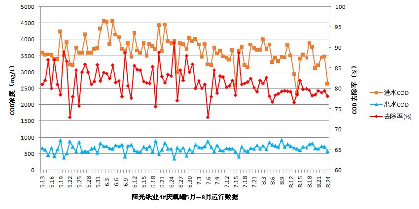 本项目采用我公司自主研发的LIC高效厌氧反应器技术,自今年5月初开始调试,经过4个月的试运行,厌氧系统一直稳定运行,并通过技术创新克服了造纸废水钙离子浓度高导致的颗粒污泥钙化问题,使污泥活性保持在较高水平。厌氧反应器CODCr容积负荷达到17.0kg/ m3•d以上,CODCr的去除率可稳定达到80%以上,远超过目前国内外造纸行业废水厌氧处理CODCr70%的去除率。本项目运行效果稳定,保证了出水水质达标排放,获得了业主的高度评价和赞誉!